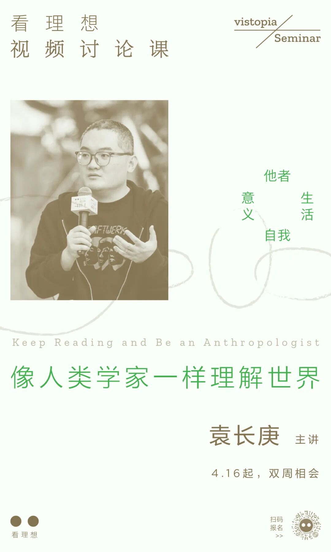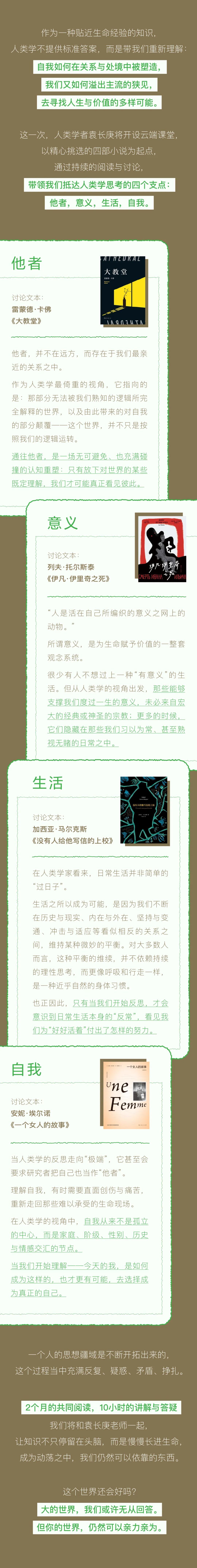 人类学者袁长庚与看理想共同策划,以《大教堂》《伊凡·伊里奇之死》《没有人给他写信的上校》《一个女人的故事》四部经典小说为起点,通过持续的阅读与讨论,带领我们抵达人类学思考的四个支点——
