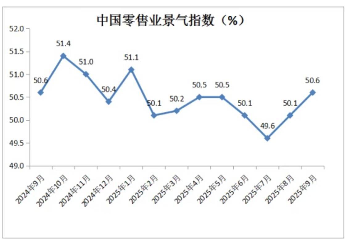 数据显示,9月份,中国零售业景气指数为50.6%,环比上升0.5个百分点,连续2个月上升。从行业分类来看:商品经营类指数50.6%,环比上升0.9个百分点;租赁经营类指数为51.4%,环比下降0.7个百分点,继续维持在中高位景气区间;电商经营类指数重回扩张区间,其中电商在线总商品数指数较上月回升0.8个百分点,结束4个月以来的下降趋势。