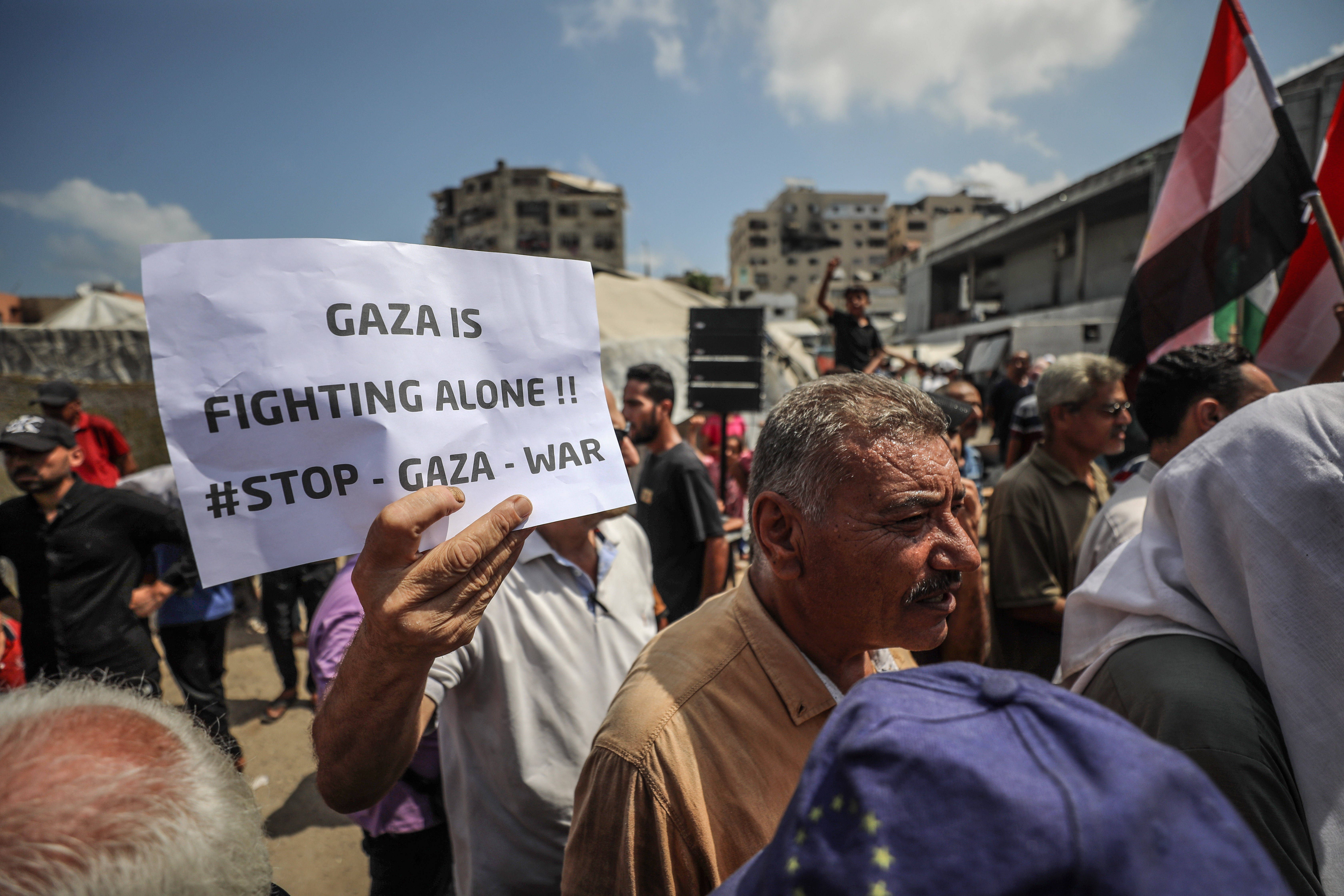 8月21日,数百名巴勒斯坦人聚集在加沙城的市中心,要求以色列停止战争和驱逐平民,呼吁国际社会保护加沙平民。新华社发(里泽克·阿卜杜勒贾瓦德摄)埃及外交部发表声明,“强烈谴责”这次空袭。德国外交部在社交媒体上就这次空袭导致多名记者、医护人员以及平民遇难表示“震惊”。法国总统马克龙则在社交媒体上表示,这次袭击“不可容忍”,媒体必须能够“报道本轮巴以冲突的真相”。英国外交大臣拉米也对这次事件表示“震惊”。
